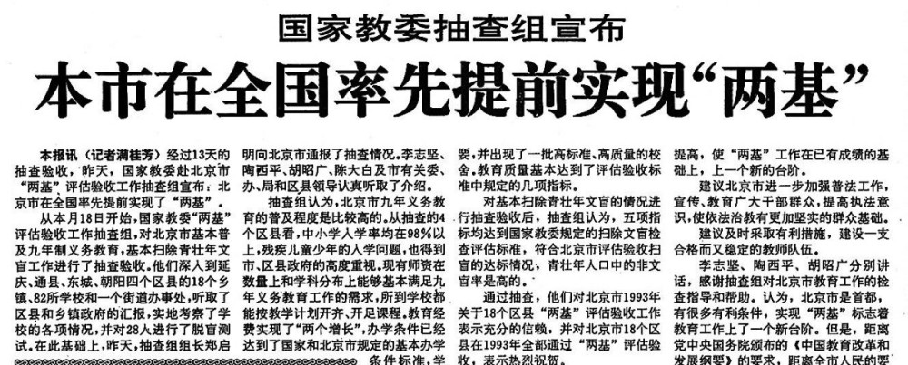 有了汉语拼音的助力,扫盲识字工作进展迅速。1964年,我国在进行第二次人口普查的同时,也对国民的文化素质进行了一次全面的调查。结果显示:15岁以上人口的文盲率,已经由解放初期的80%下降到了52%;1亿多人摘掉了文盲的帽子。1993年,北京在全国率先提前实现“两基”,即“基本普及九年义务教育,基本扫除青壮年文盲”。(1993年10月31日《北京日报》1版,《本市在全国率先提前实现“两基”》)