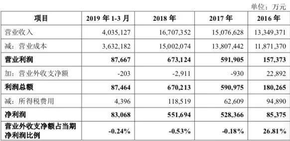 金龙鱼招股书显示,2016年、2017年、2018年及2019年1-3月,公司营业收入分别为1334.94亿元、1507.66亿元、1670.74亿元和403.51亿元,实现净利润分别为8.54亿元、52.84亿元、55.17亿元和8.31亿元。