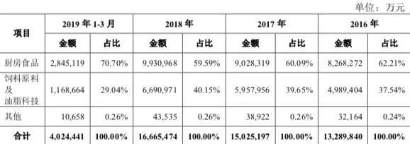 而作为国内最大的农产品和食品加工企业之一,金龙鱼的主要产品包括厨房食品、饲料原料及油脂科技产品。从收入构成来看,2016年-2019年3月份,金龙鱼的厨房食品为其贡献了一半以上的收入。