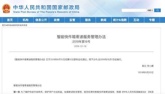 7月19日,国家邮政局官方网站对外发布《智能快件箱寄递服务管理办法》。封面新闻记者注意到,根据该管理办法,智能快件箱使用企业使用智能快件箱投递快件,应当征得收件人同意;收件人不同意使用智能快件箱投递快件的,智能快件箱使用企业应当按照快递服务合同约定的名址提供投递服务。据了解,该办法将自2019年10月1日起施行