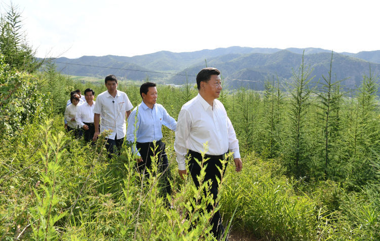 15日,习近平在赤峰市喀喇沁旗马鞍山林场林区,沿着崎岖的护林小道察看林木长势。
