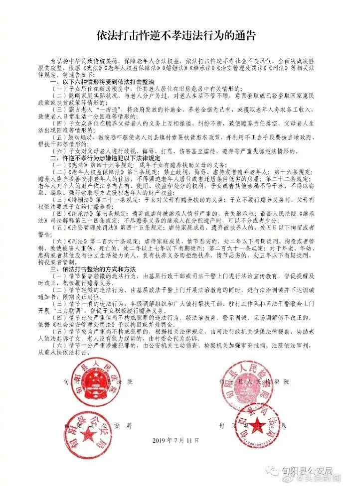 近日,陕西省安康市旬阳县发布的一则《依法打击忤逆不孝违法行为的通告》,引发了诸多争议。通告称,将对“子女居住在新房楼房中,任其老人居住在旧房危房中”“隐瞒家庭实际状况,与老人分户另过,对老人生活不管不顾”“霸占老人‘一折通’,将政府发放的补助金、养老金据为己有”“子女众多但在赡养父母老人的义务上互相推诿、纠纷不断”等6种情形展开打击整治。