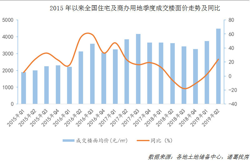 与往年相比,2019年前3月地方供地节奏明显放缓,供地面积处于历史较低水平。第二季度以来,随着房地产市场的逐渐回温,供地力度明显加大,热点城市土地竞拍热度提升,带动全国住宅用地成交楼面价明显上涨。