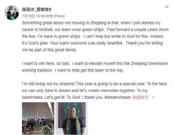 穆谢奎自加盟浙江绿城的几天里,得到了浙江球员的热烈欢迎!这令大奎十分感动,今天上午,穆谢奎在社交平台上再一次发布一篇长文,主要向浙江球迷和俱乐部的欢迎表示感谢,大奎说:“刚开始足球生涯的时候就身穿绿色球衣,而几年以后,他再一次又回到了绿色的阵营之中。我忍不住为此向上帝微笑。的确,这是上帝的计划。你们的热烈欢迎真是让人感动。谢谢你让我成为这个大家庭的一员。我想在这里赢,我想帮助这支球队登上榜首。我仍在实现我的梦想!今年将是一个特殊的一年。对球迷们来说:我们只能大胆做梦,让我们一起创造回忆。我的队友们:让我们开始吧!上帝:我谢谢你。”