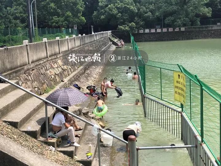 而在水库边另有一番热火朝天、欢声笑语的场面。岸边,十几个大人、小孩在水里游泳嬉戏。“岸边水浅,这里最深的地方也就1.5米左右,玩玩水安全的。”在岸边看护孩子的沈小姐说,最近几乎每天她都带着孩子来水库玩上一两个小时。