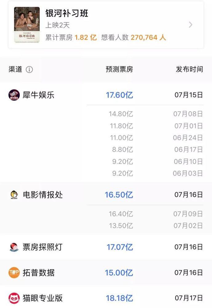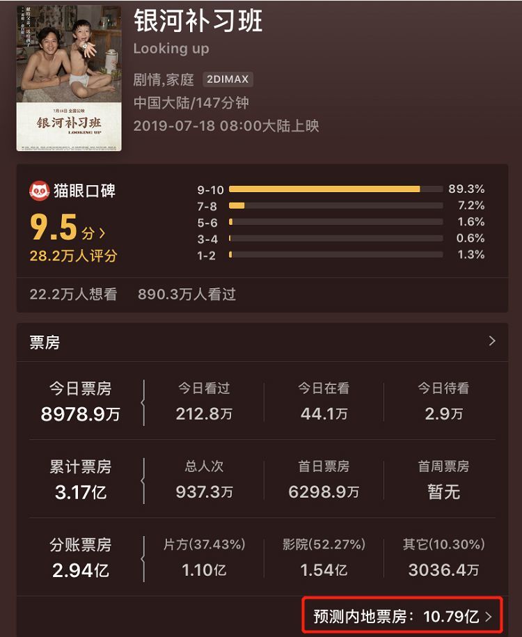 猫眼专业版预测《银河补习班》票房为10亿左右