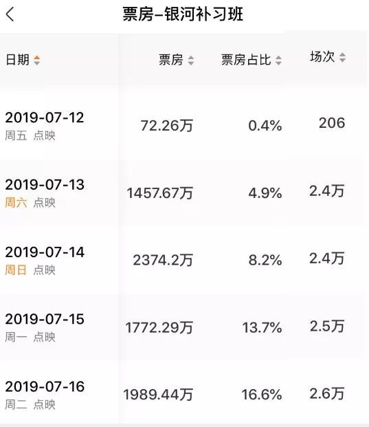 从实际效果来看,《银河补习班》的点映似乎并没有在口碑与票房上掀起风浪。与去年《我不是药神》点映后口碑迅速爆炸,单日排片只有2.5万场(9%占比)、3.1万场(10%占比)却能拿到4800万、6500万票房成为当日头名不同,同样是2.5万场的场次,《银河补习班》数日的单日点映票房不足2000万。