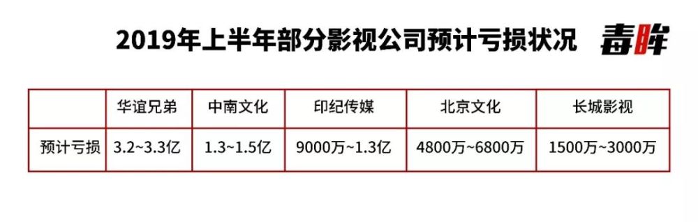 目前已经发布业绩预告的公司来看,2019年上半年,众多2018年上半年仍然盈利的公司都在今年出现了亏损,包括华谊兄弟预计亏损3.2~3.3亿,中南文化预计亏损1.3~1.5亿,印纪传媒预计亏损9000万~1.3亿,北京文化预计亏损4800万~6800万,长城影视预计亏损1500万~3000万……