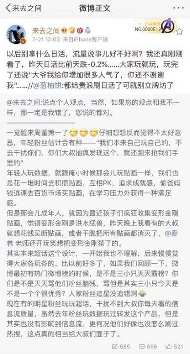 7月21日,对于“周杰伦冲超话榜第一”,微博CEO王高飞在微博上表示,粉丝追星没追错,年轻人玩数据,就跟他们小时候那会儿玩贴画一样。不过,王高飞表示,尽管大量周杰伦粉丝涌入微博打榜,但当日微博日活并未因此增加,甚至比前天跌了0.2%。