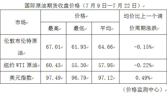 据国家发改委价格监测中心监测,本轮成品油调价周期内(7月9日—7月22日),国际油价先升后降,平均来看,伦敦布伦特、纽约WTI油价比上轮调价周期微降0.19%。按现行国内成品油价格机制测算,调价金额每吨不足50元,本次汽、柴油价格不作调整,未调金额纳入下次调价时累加或冲抵。