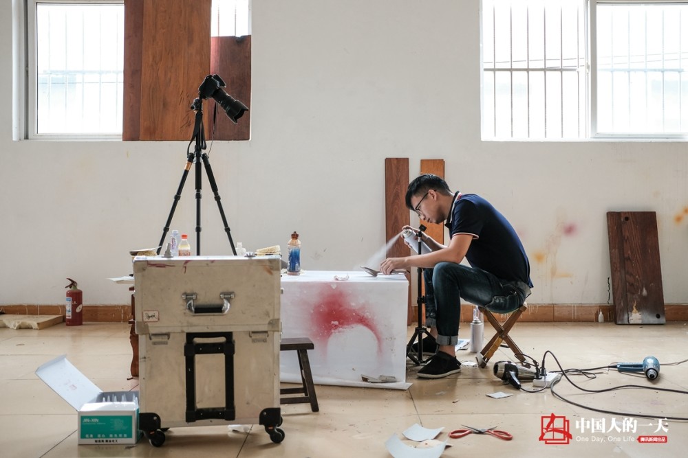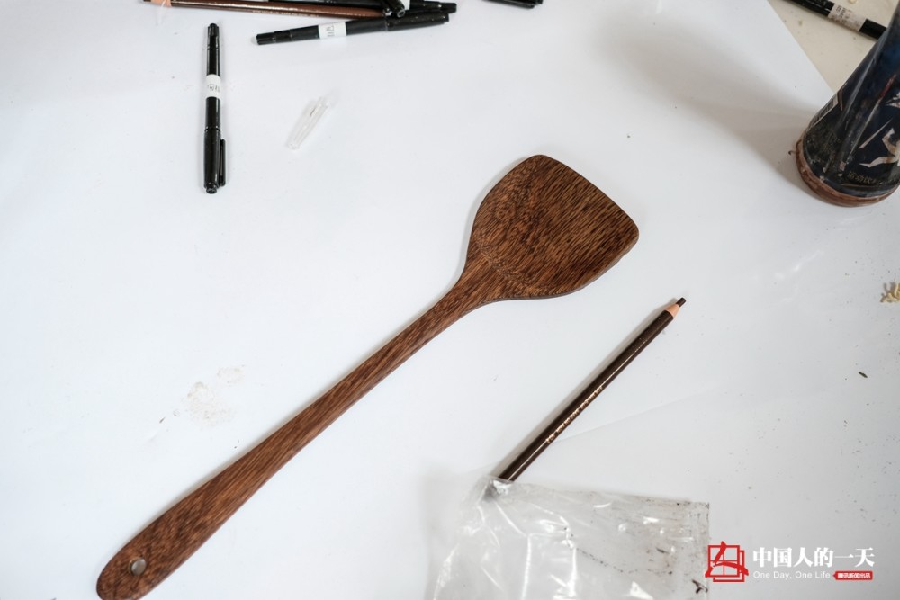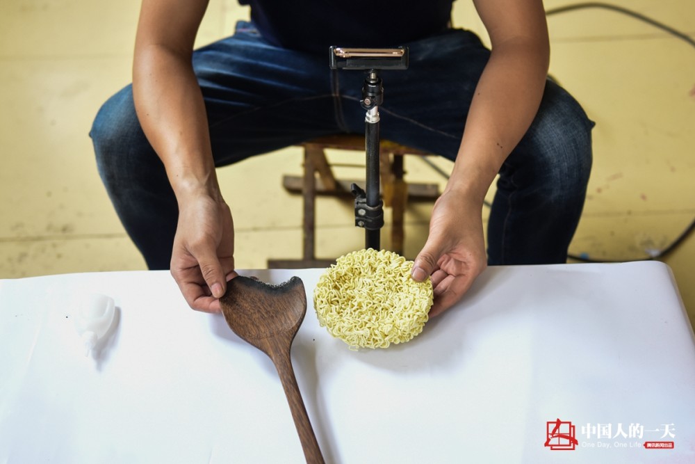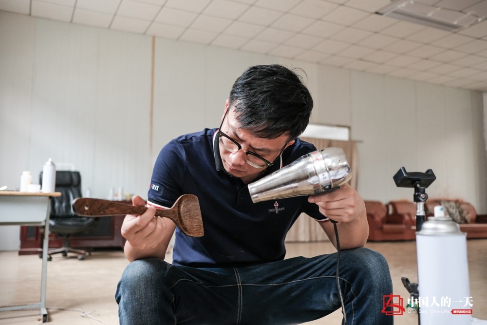 第一次见到汪伟时,他正在他工厂车间的一个角落里拍短视频——一把被烧了半边的木头铲子,糊上碾碎的方便面,用胶水固定,然后填坑、打磨、上色、喷漆……一系列神操作之后,铲子竟然神奇地复原了。即使已经在网络上看过汪伟的短视频,亲眼见到这个过程仍然令人震惊。