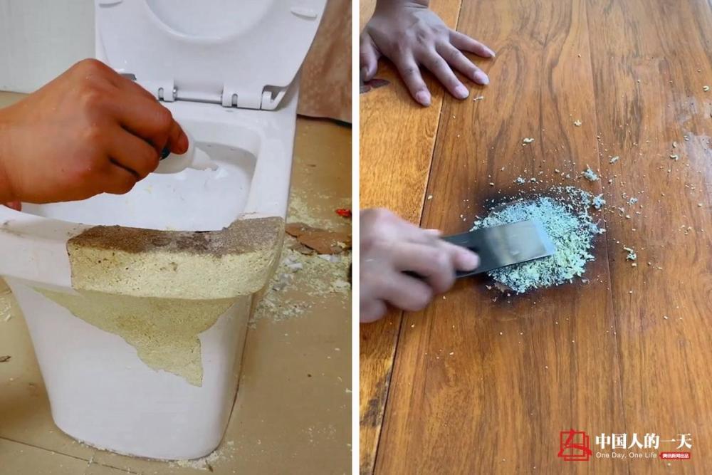 无论是桌子掉了个角、马桶破了个大洞,还是饭铲被烧了半边、地板被烫了个窟窿……所有的这些都能用方便面填充并修复,而且修复完成后,从外表上看都完好如初。