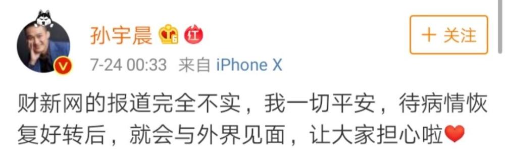 而孙宇晨微博也于7月24日凌晨发布消息对相关报道予以否认。孙宇晨微博中表示,待病情恢复好转后,会与外界见面。