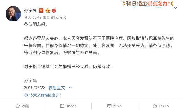 7 月 23 日凌晨,这位拍下今天巴菲特午餐的话题人物宣布因突患肾结石,将取消周四的巴菲特午餐。