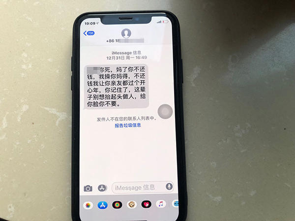 随之而来的是各种催收电话短信。有打给单位领导的,说袁雪是老赖,欠钱不还,领导找她谈话,她就说是自己信息泄漏了;有把P图照片发给闺蜜、朋友的,裸照、灵堂照片都有,旁边还配上老赖字样等等。自己接到的电话更粗暴,袁雪记得,一个女的催收员说,要一天打100个电话,让她24小时不得安宁,大年三十送花圈到她家。