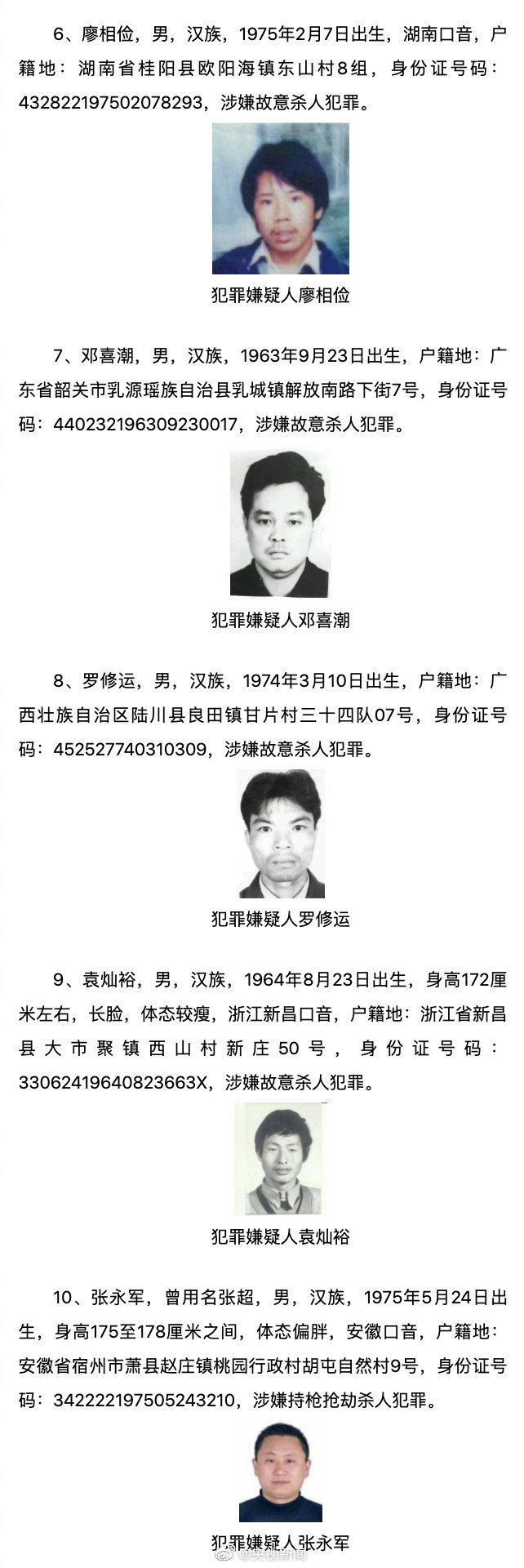 请广大人民群众发现以上在逃人员线索后,积极向当地公安机关110指挥中心举报。对提供有效线索,为抓捕工作发挥关键作用的人员,每抓获一名在逃人员公安部将给予人民币10万元奖励。