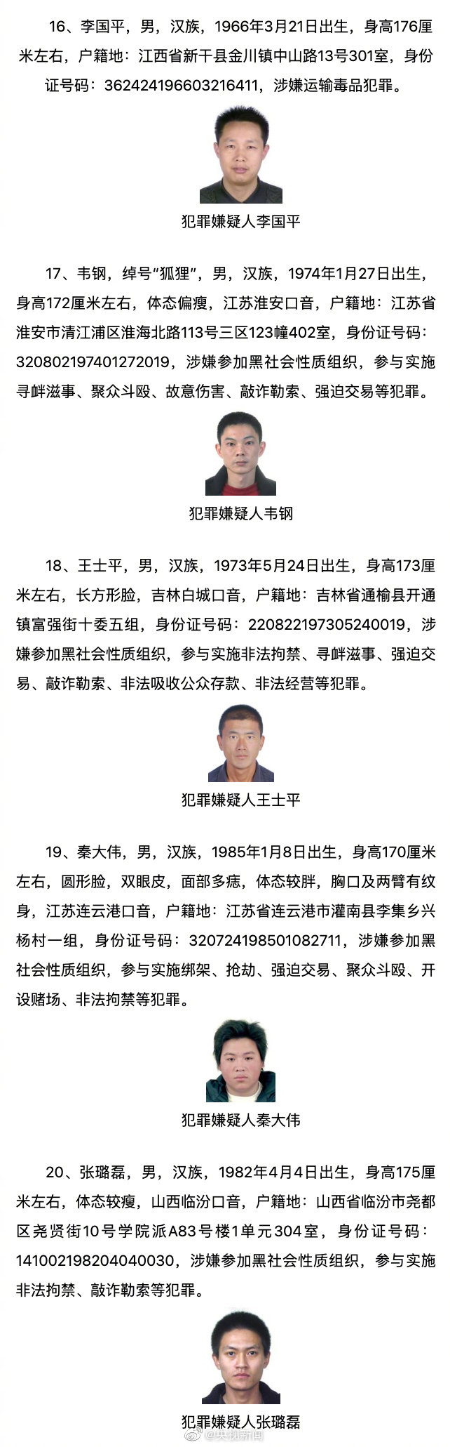 19、秦大伟,男,汉族,1985年1月8日出生,身高170厘米左右,圆形脸,双眼皮,面部多痣,体态较胖,胸口及两臂有纹身,江苏连云港口音,户籍地:江苏省连云港市灌南县李集乡兴杨村一组,身份证号码:320724198501082711,涉嫌参加黑社会性质组织,参与实施绑架、抢劫、强迫交易、聚众斗殴、开设赌场、非法拘禁等犯罪。