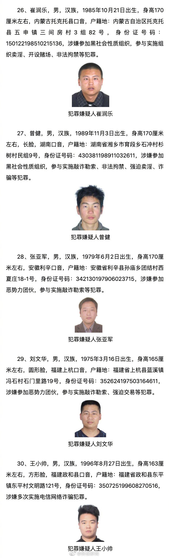 30、王小帅,男,汉族,1996年8月27日出生,身高163厘米左右,方形脸,福建政和县口音,户籍地:福建省政和县东平镇东平村文明路121号,身份证号码:350725199608270516,涉嫌多次实施电信网络诈骗犯罪。