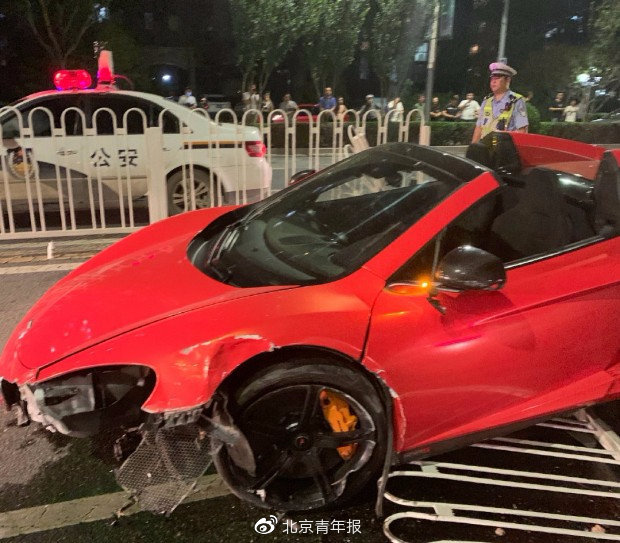 北京青年报记者看到网友转发的视频和图片,一辆红色跑车撞到护栏上,导致10多米长的护栏被撞倒,该车的前保险杠被撞掉,其中一个车轮爆胎。据一名懂行的市民介绍,迈凯伦跑车的市场报价至少为两三百万元,而视频中被撞的轿车估算为四五百万元。