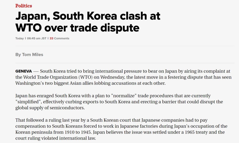 据报道,日韩两国之间就半导体原材料断供问题闹上了WTO(世界贸易组织)总理事会。会上,韩国表示出对日本拒绝通过对话解决这一问题的不满。韩国产业通商资源部新通商秩序战略室室长金胜镐表示,拒绝对话表明日本没有勇气和自信直面自己的行为。
