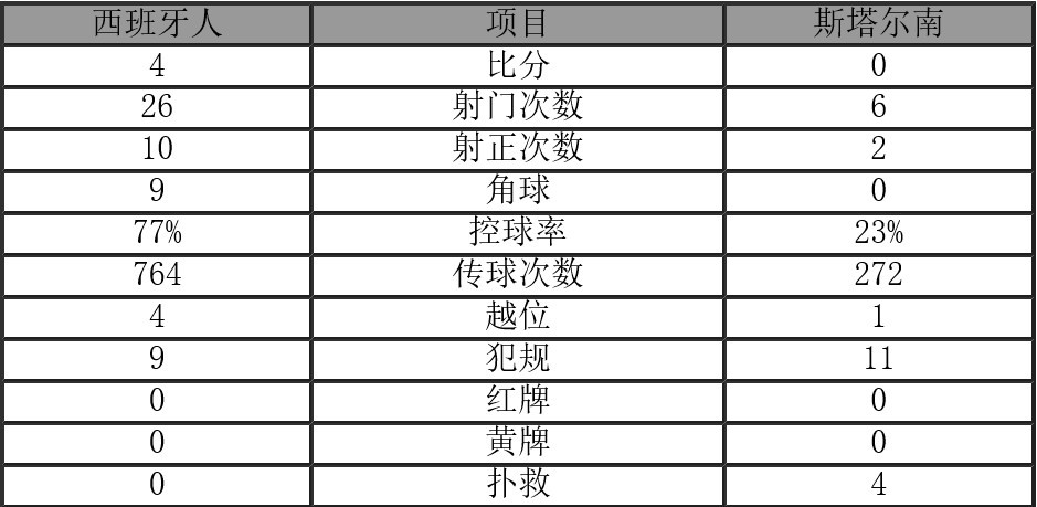 西班牙人完全统治比赛,上半场得势不得分,下半场前22分钟就打进4球。数据来看,西班牙人射门26比6,射正10比2,角球9比0,控球率达到77%,完全是一边倒。