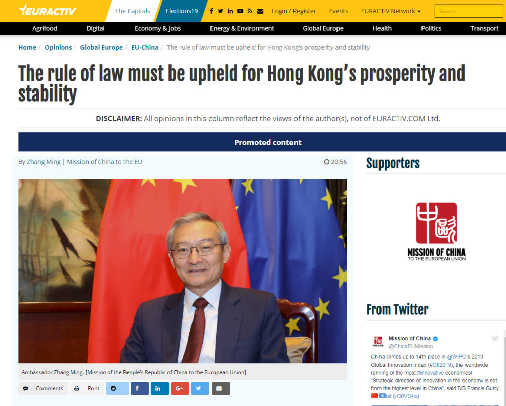 据中国驻欧盟使团网站7月26日消息,2019年7月25日,驻欧盟使团团长张明大使在《欧盟动态》网站发表署名文章《维护香港的繁荣稳定必须坚持法治原则》,全文如下: