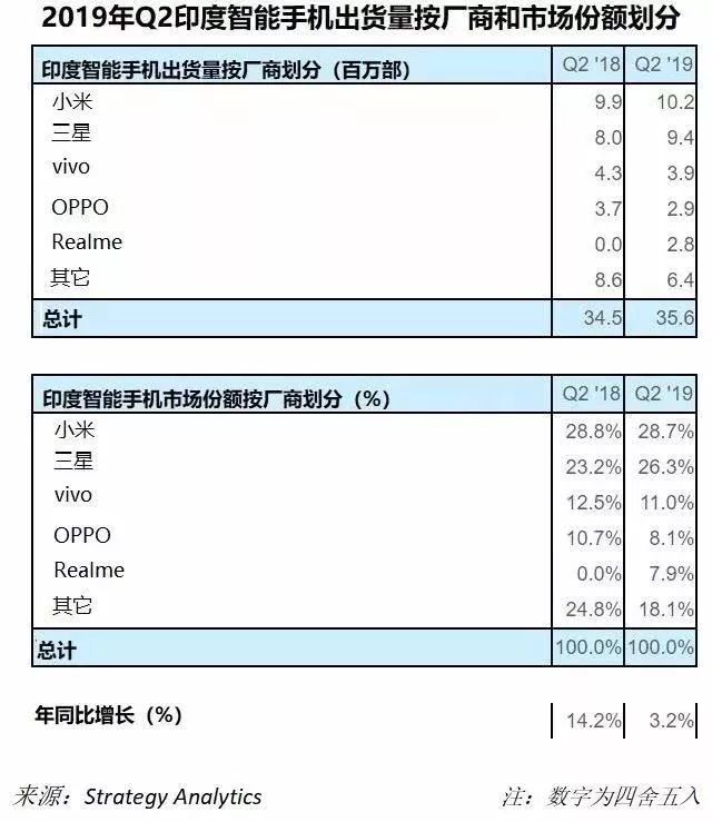 就在今天知名市场调研机构Strategy Analytics给出了2019年第二季度印度市场的数据报告: