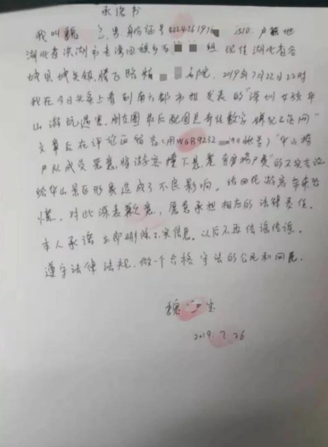 经查,该网友所述内容与事实严重不符,华山景区并无此类事。初步查明,该网民为魏某宝(男,42岁,湖北洪湖市人),我局立即指派网安大队民警赶赴湖北洪湖市,在当地警方的配合下,对魏某宝依法控制,其如实交代在网上不实言论的违法事实。目前,魏某宝已被湖北省谷城警方依法行政拘留。