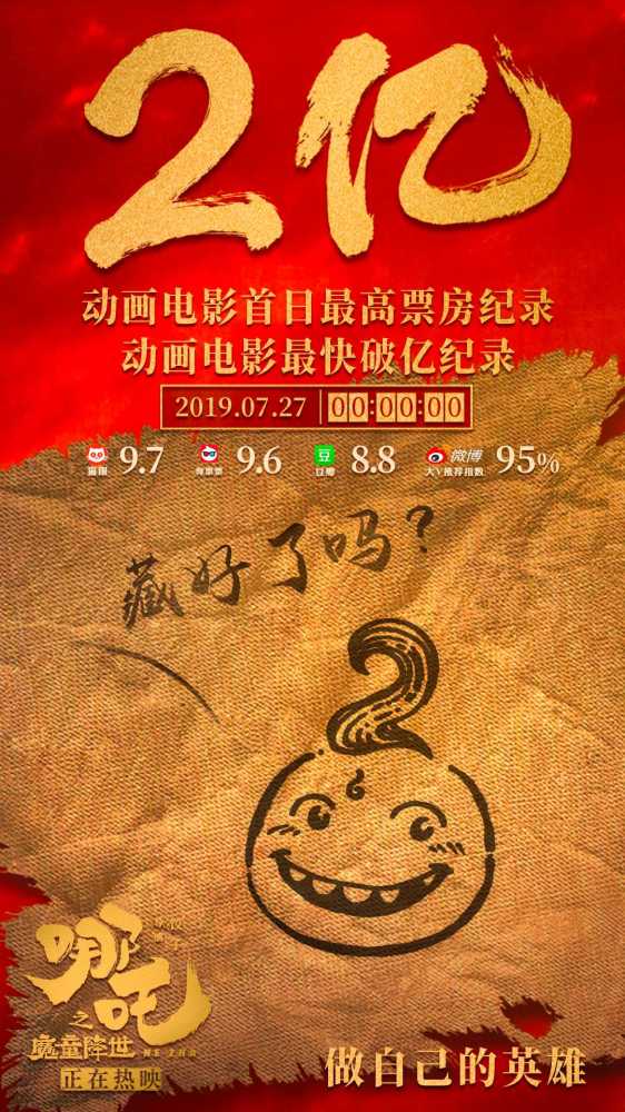 暑期档在《哪吒:魔童降世》的全面开画下强势回暖,26日(周五)大盘回到2亿级别,报收2.18亿。其中《哪吒》取得1.37亿,累计票房达到1.99亿,在27日累计票房正式突破2亿。目前,影片豆瓣评分达到8.8分,超过了《西游记之大圣归来》的8.3分。在周六27日的排片上,本片的排片占比已经上升到42%,这也是动画电影排映的纪录。本周末影片票房有望冲击6亿。
