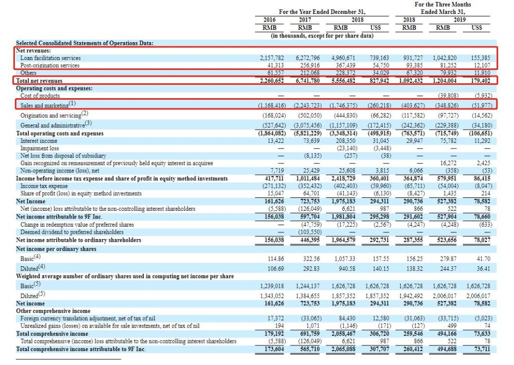 招股书显示,2016年到2018年,玖富集团的净收入分别为22.61亿、67.42亿和55.57亿元人民币;同期净利润分别为1.62亿、7.24亿和19.75亿元人民币;不过,剔除股权薪酬支出影响,2016年、2017年、2018年、2019年一季度,玖富调整后净利润分别是2.7亿元、29亿元、24.8亿元、5.61亿元,过去三年净赚56.5亿元。