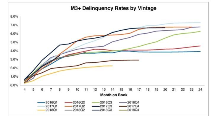 在贷款资产质量表现上,玖富2016年~2018年逾期率表现如下,M3+逾期率(M3+ delinquency rate,Vintage口径超过90天)有明显提升: