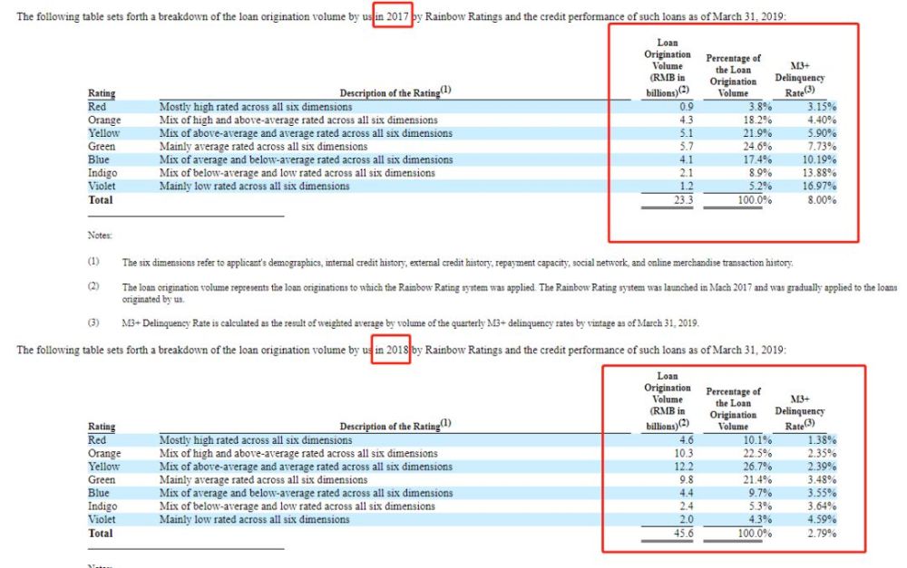 玖富按借款人的信用资质分为7个等级,每个等级的贷款余额及M3+逾期率测算不一样,最后合计整体M3+逾期率。招股书显示,截至2019年3月底,玖富平台M3+逾期率累计为8%。