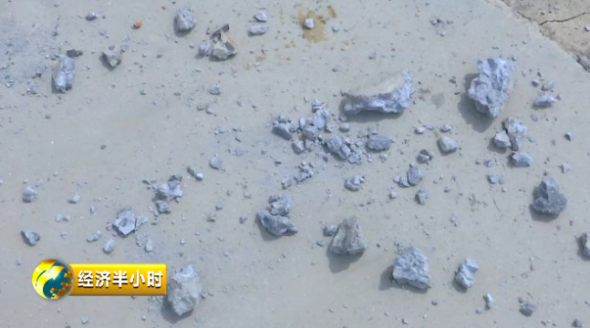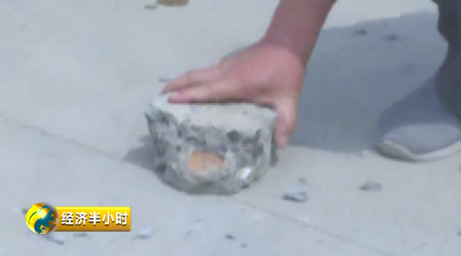 7月16日,《经济半小时》记者在学校地上看到堆放了一个多月前打掉地梁后留存的部分水泥渣块,果然一摔就碎。张光启又随手拾起从其它地方打掉的旧水泥块,往地上一摔,结果还是一个整块,水泥的凝固度显得很结实。