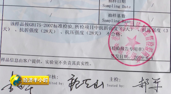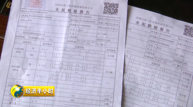 河南省淮阳县亿捷工程质量检测公司出具的检测报告,第三方的检测结果显示:水泥抗折强度、抗压强度均不合格。跟国家标准相比较,每一样都不合格。