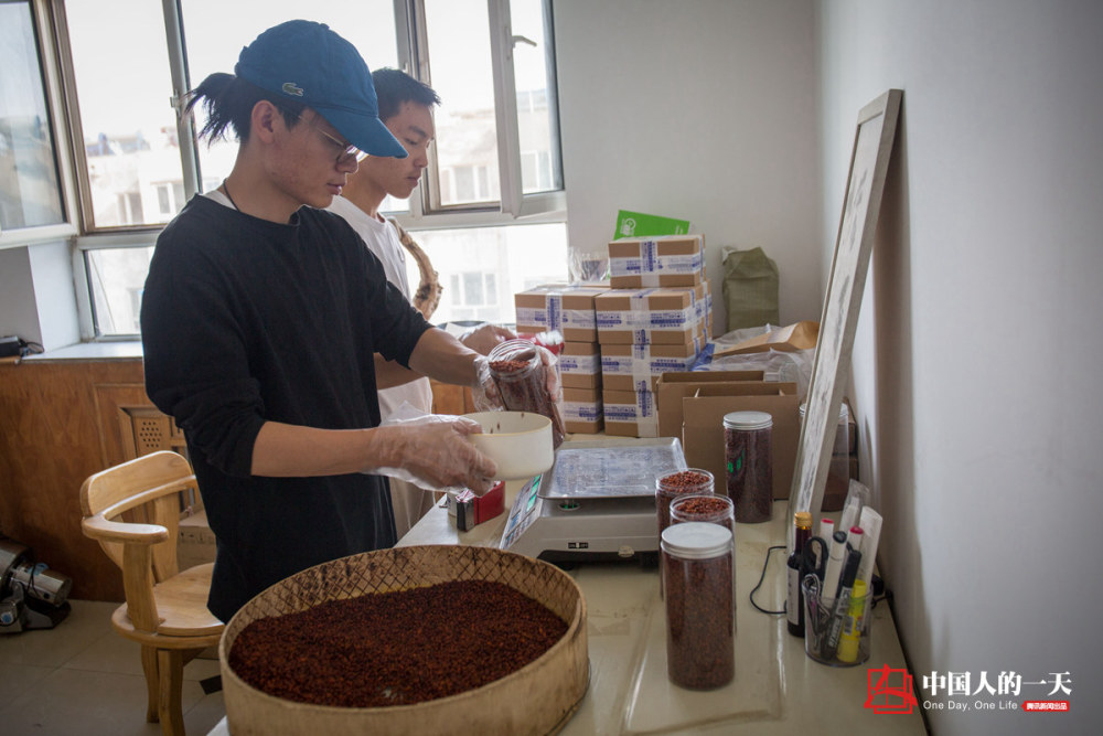 21日上午,周大帅将沙棘果称重、包装。在这里通过网络,销往全国,甚至海外。由于订单量大,一个人忙不过来,周大帅便把刚参加完高考的堂弟从湖南老家请到喀什来帮忙。