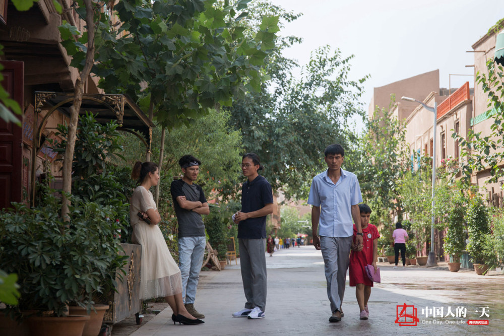 6月21日,喀什老城阿热亚路,周大帅与维吾尔族朋友们聊天。