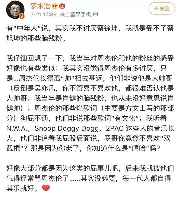 打榜活动结束没多久,罗永浩发布了一条微博,以“每一代人都自得其乐就好”作为结尾。