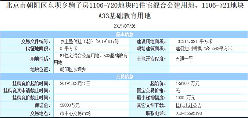 出让一宗住宅混合公建用地和基础教育用地,土地面积31314.227 ㎡,建面85543㎡,综合容积率2.73,五通一平,起拍总价18.9亿元,竞价阶梯1000万,竞买保证金3.8亿元。