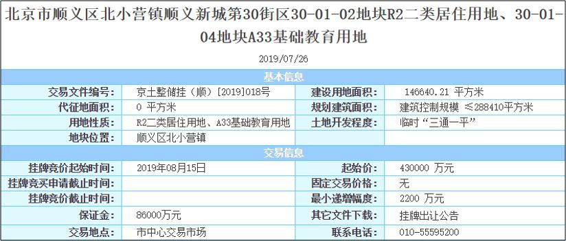地块基础教育用地由竞得人投资建设,建成后无偿移交给北京市顺义区教育委员会。