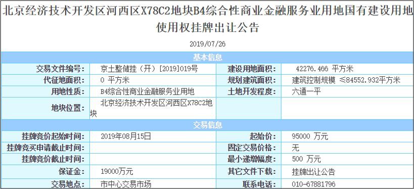 出让一宗综合性商业金融服务业用地,土地面积42276.466㎡,建面84552.932㎡,容积率2,六通一平,起拍总价9.5亿元,竞价阶梯500万,竞买保证金1.9亿元。