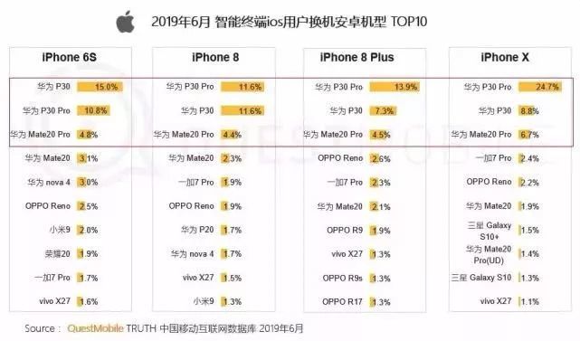 此外,根据QuestMobile发布的半年报告显示,苹果在中国市场的用户忠诚度有所下降,其在转向安卓阵营的同时更多地选择了华为。