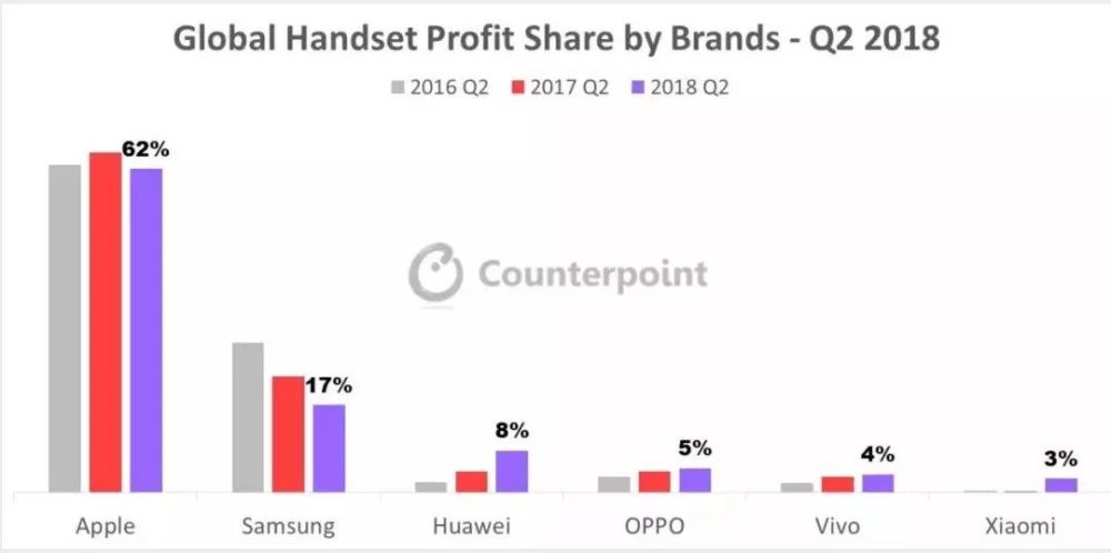 需看到,苹果依然拿了整个行业超60%的利润,据CounterpointResearch的研究报告显示,在2018年第二季度产生的所有手机利润中,iPhone的利润占比达到了62%,三星的利润占比为17%,华为、小米的利润分别仅为8%与3%。
