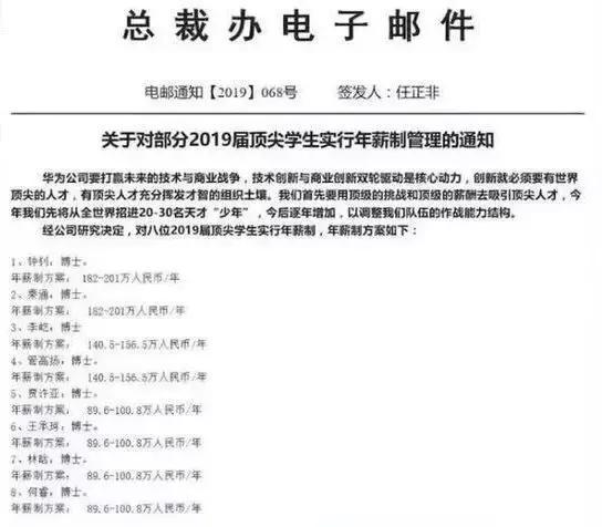 7月23日,华为总裁办发布了一封邮件,宣布对8位2019届应届博士毕业生实行年薪管理制度。