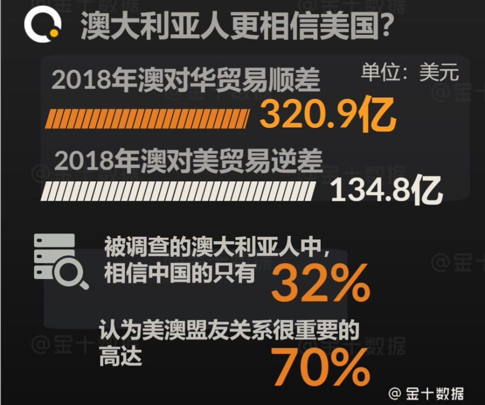 在过去的2018年,澳大利亚向中国出口了价值876.1亿美元的商品(相比上年增长了14.7%),并赚取了320.9亿美元的贸易盈余。然而,澳大利亚与中国经贸关系日益密切的同时,澳大利亚人对中国的信任程度却创下15年来的新低。