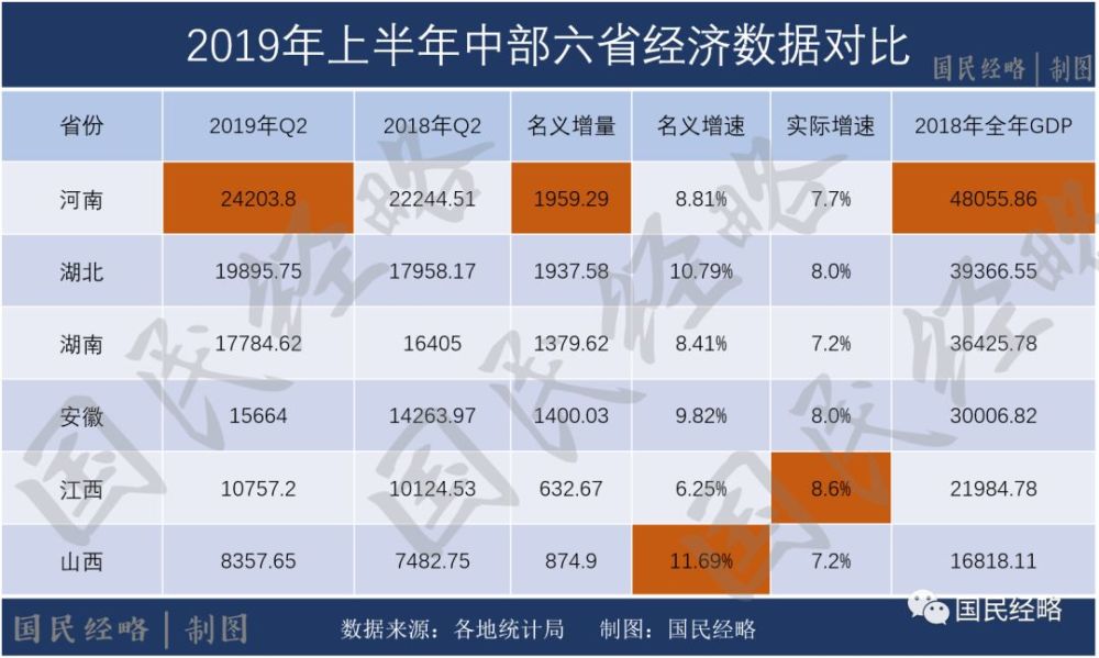 今年上半年,中部六省的经济增速分别为:江西(8.6%)、安徽(8.0%)、湖北(8.0%)、河南(7.7%)、湖南(7.2%)、山西(7.2%)。