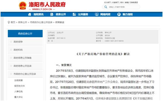根据这份解读,2017年5月5日,住建部到河南省召开房地产形势座谈会时指出,洛阳市因年初以来房价过快增长,被列为国家房地产重点监控城市,要求其严控房价,保持房地产市场稳定。2017年7月20日,住建部在北京召开房地产工作会商会,要求洛阳市政府出台调控措施措施,确保房地产市场价格在5月9日签约均价基础上不上涨,月环比不增加。