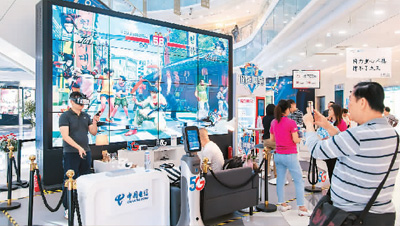 中国电信为消费者提供5G应用场景。上海市民正在商场内体验5G手机的高速网络和5G+8K云VR以及云游戏。(王冈/人民图片)