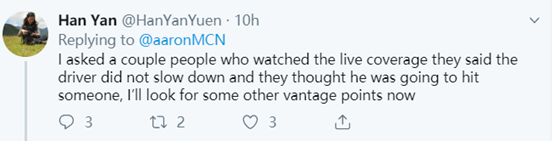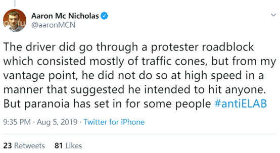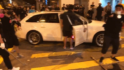 耿直哥从网络找来的一段直播视频,也还原了当时事情的全貌。就如这位彭博社记者所说,白车司机之前虽然开车穿过了一处被黑衣暴徒们非法设置的路障,但他仅仅是驾车缓缓通过,并没有加速,也确实没有要撞人的意思。