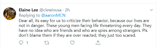 震惊吧?但这还不是最脑残的!因为下面这个暴徒的支持者居然宣称这些暴徒之所以会这么做,是因为他们“太害怕”了。她还因此要求人们不要去谴责这些暴徒的暴行,因为这些“年轻人”每天都面临着“危及生命的情况”,“无法确定谁是朋友谁是间谍”,所以他们“这么表现不该被责备”。