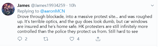 比如下面这个人竟然责备起受害的司机来。他一边说辱骂开车穿过暴徒们非法设置的路障的司机是个“蠢货”, 一边则轻描淡写地说反正司机安全到家了,车子也有保险。所以他的结论是“抗议者”远比警察克制。